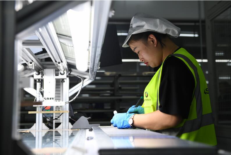 9月26日,在松原市新能光伏科技有限公司,工作人员检查光伏组件。