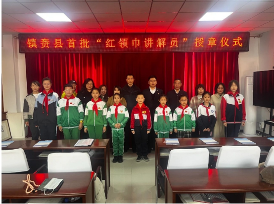共青团镇赉县委书记张东旭、县退役军人事务局副局长李洪涛、教育局团委书记袁微、镇赉县少工委办公室主任刘鑫和部分中小学校大队辅导员、团书记为“红领巾讲解员”颁发“红领巾讲解员”纪念章,勉励他们在红领巾奖章的激励下,在星星火炬的照耀下,树立新的目标与志向,努力成长为能够担当民族复兴大任的新时代好少年,传承红色基因,赓续红色血脉,当好红色传人。