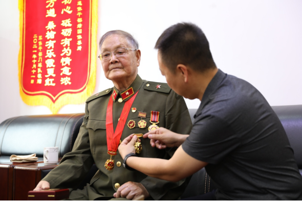 关爱老兵志愿者为老兵汪延开佩戴军功章
