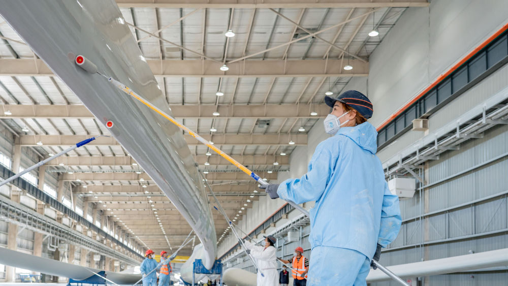 9月27日,吉林省洮南市上海电气洮南风电产业园内,工人正在涂装风机叶片。记者 唐成卓 摄