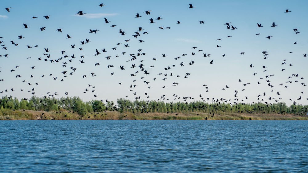 9月23日,吉林省大安市嫩江湾湿地保护保育区内,鸬鹚成群在江面翱翔。记者 唐成卓 摄
