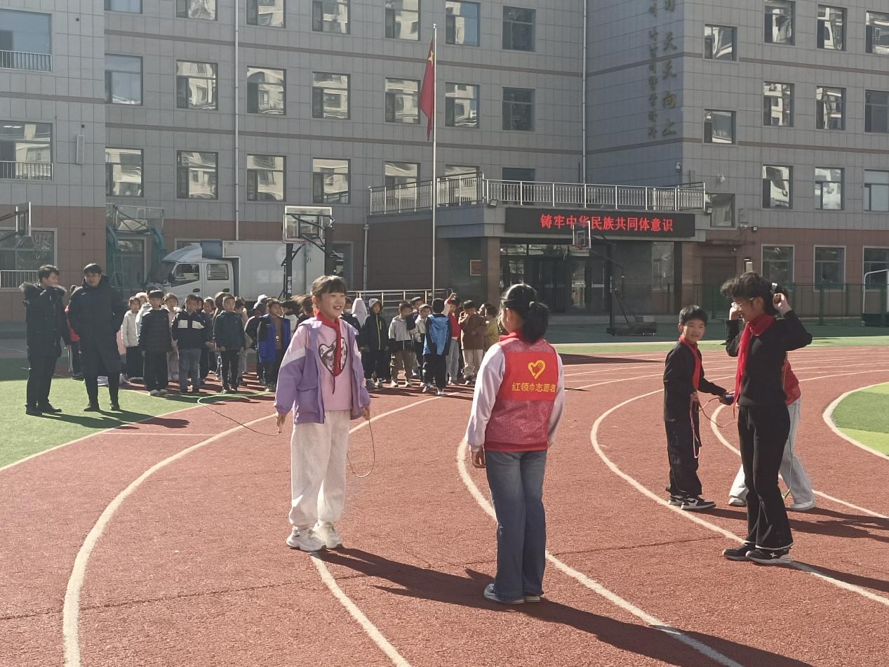 在延吉市东山小学,经常有一群穿着红马甲的“红领巾志愿者”活跃于课间的操场、走廊,提醒同学们不要追跑打闹,注意安全。