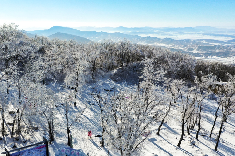 游客在吉林市萬科松花湖度假區(qū)觀賞高山霧凇景觀。