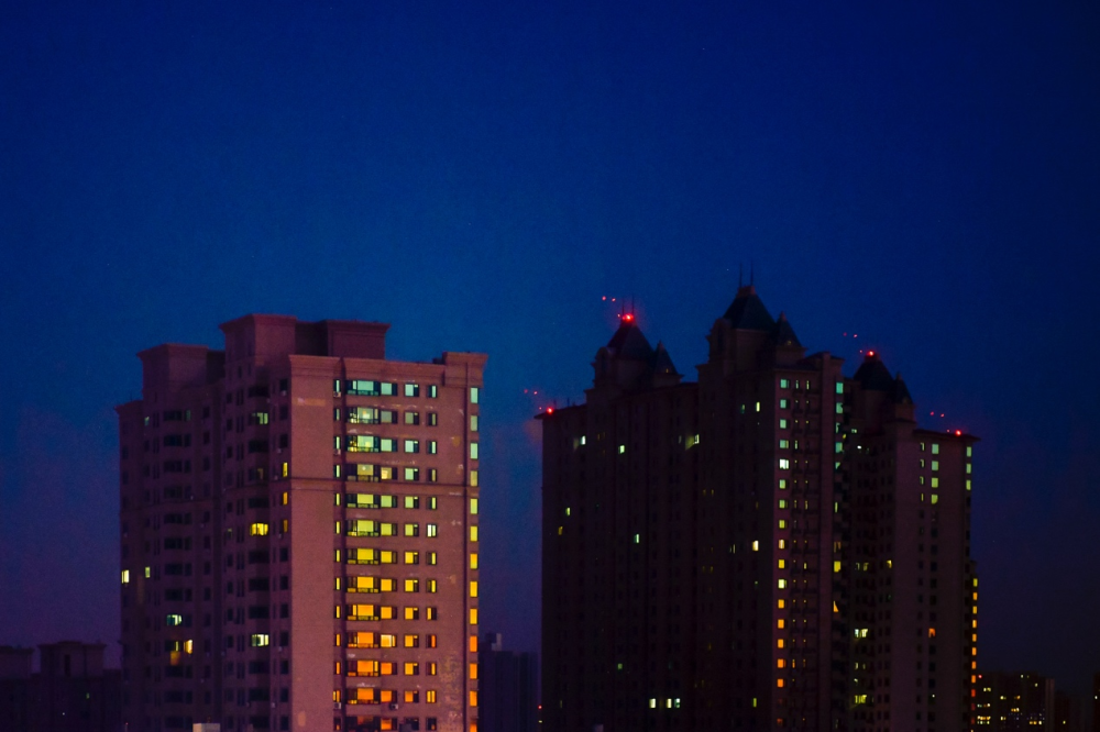 夕陽余暉照在長春市一居民樓的玻璃上。
