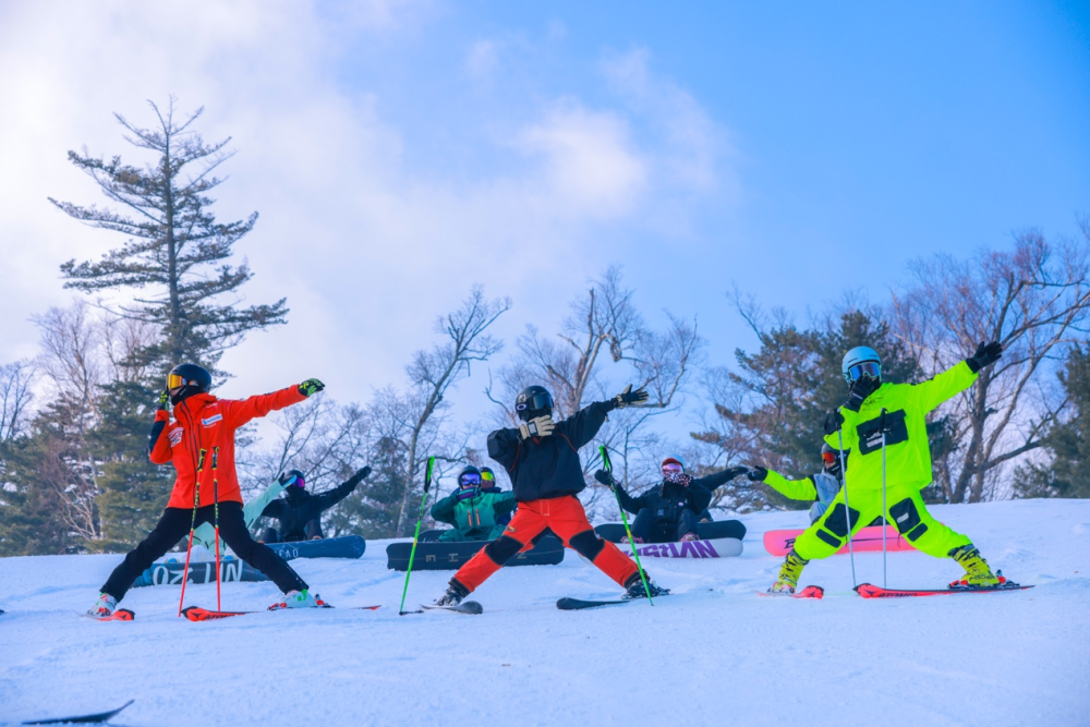 滑雪愛好者在長白山萬達(dá)國際度假區(qū)滑雪場滑雪前熱身。