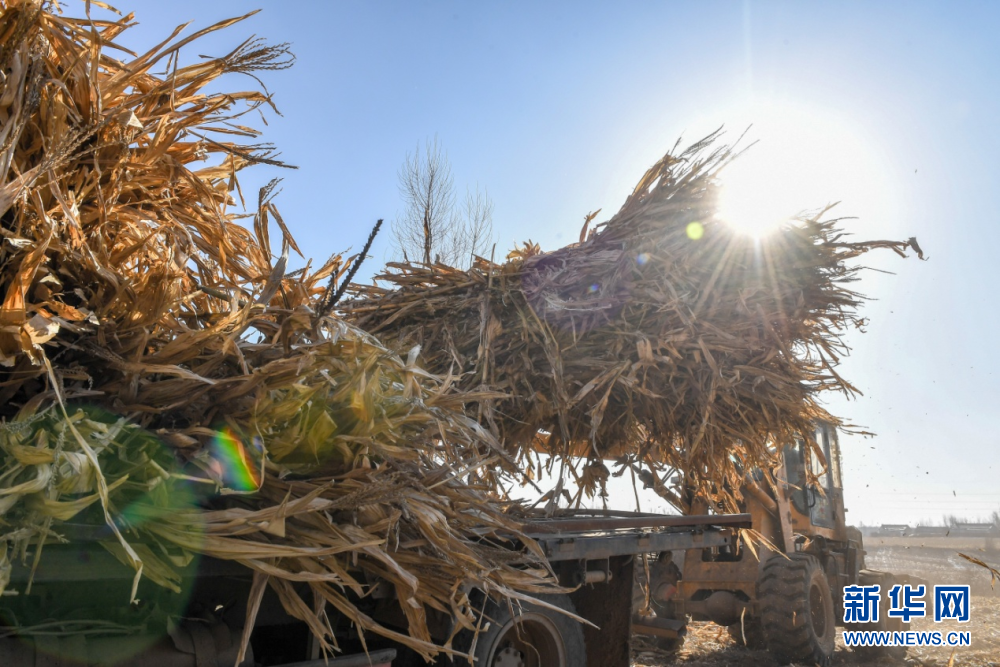 在吉林省長春市九臺區(qū)東湖街道腰站村,隆達(dá)興養(yǎng)殖農(nóng)民專業(yè)合作社農(nóng)民將玉米秸稈卸到場院。