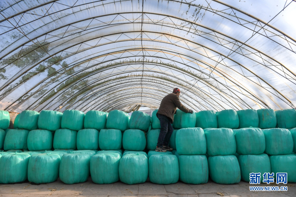 在吉林省長春市九臺區(qū)東湖街道腰站村,隆達(dá)興養(yǎng)殖農(nóng)民專業(yè)合作社農(nóng)民整理玉米秸稈壓縮包。