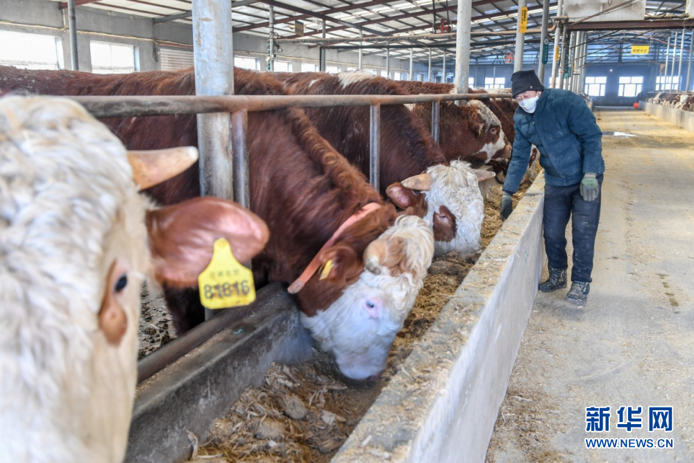 在吉林省長春市九臺區(qū)東湖街道腰站村,隆達(dá)興養(yǎng)殖農(nóng)民專業(yè)合作社農(nóng)民給肉牛投喂玉米秸稈飼料。