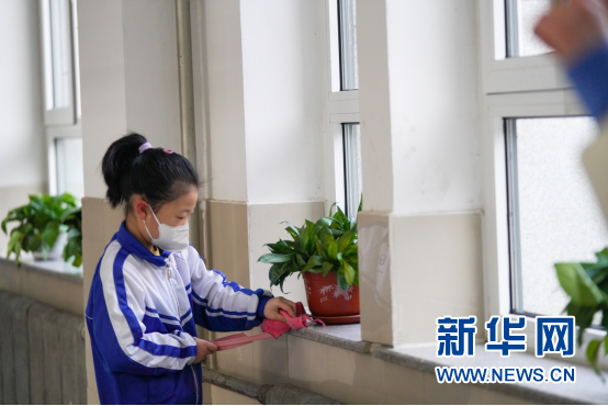2月27日,在長春市第八十七中學(xué)小學(xué)部,學(xué)生在走廊里打掃衛(wèi)生。