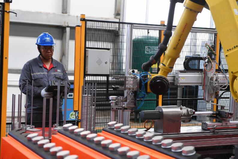 9月26日,在位于吉林松原的吉林中车风电装备有限公司,工作人员查看机器人工作情况。