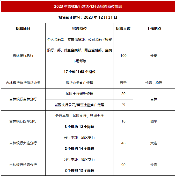 具体招聘岗位及任职条件等信息请登录吉林银行官方网站 http://www.jlbank.com.cn/,点击“关于我们-人才招聘”查看