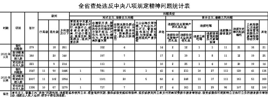 日前,记者从省纪委监委党风政风监督室获悉,为进一步加大通报曝光力度,持续传导压力、释放越往后执纪越严的信号,省纪委监委建立了全省查处违反中央八项规定精神问题情况定期通报制度。2023年9月,全省共查处违反中央八项规定精神问题279起,批评教育帮助和处理360人,给予党纪政务处分223人。