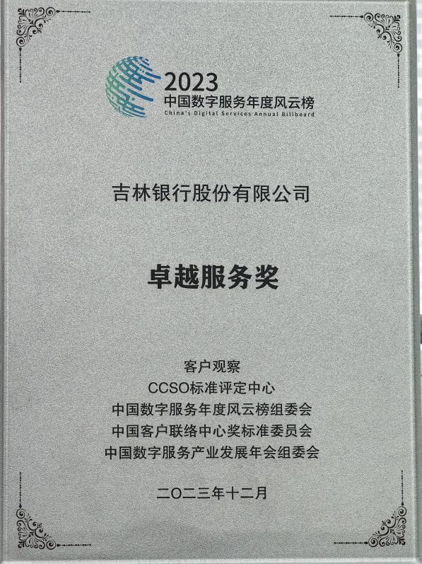 12月7日至8日,2023(第八届)中国数字服务产业发展年会在长沙举办,吉林银行远程银行中心凭借优质的客户体验、卓越的服务口碑,入选“2023中国服务品牌100强”榜单,并获“2023年度卓越服务奖”殊荣。