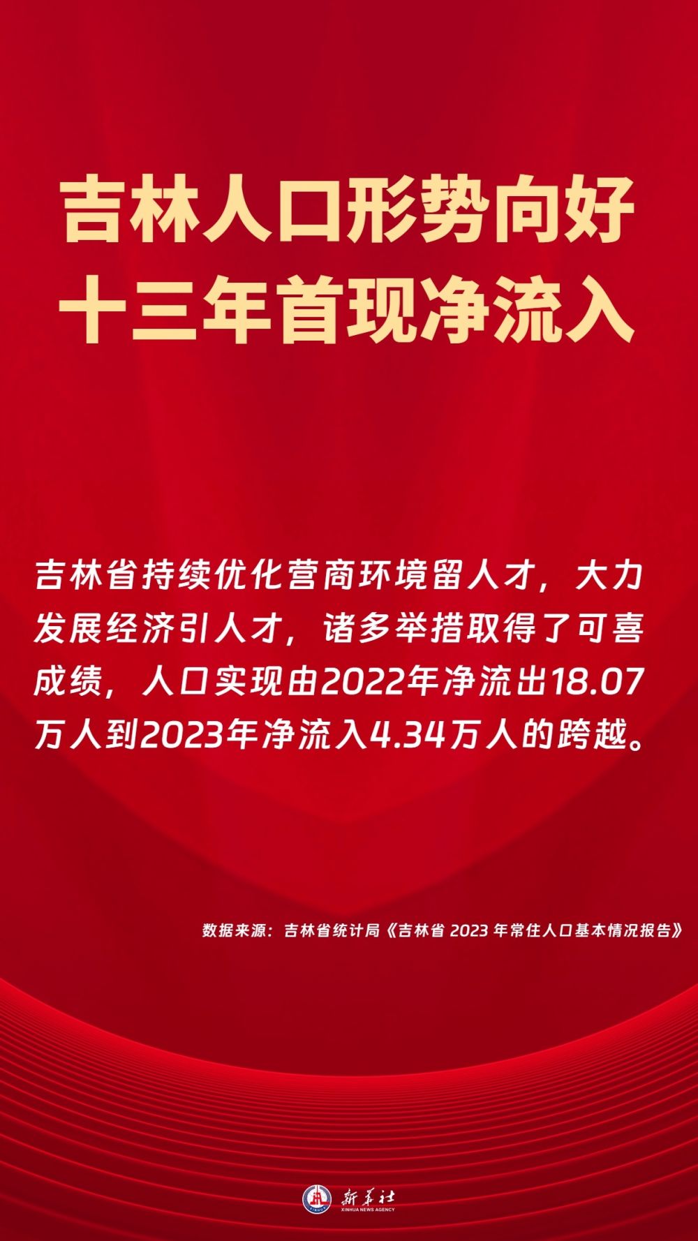 报告称,吉林省持续优化营商环境留人才,大力发展经济引人才,人口实现由2022年净流出18.07万人到2023年净流入4.34万人的跨越。
