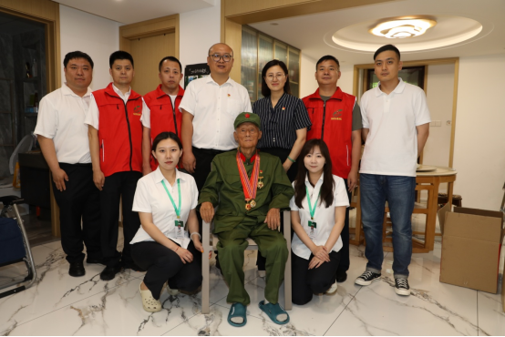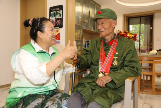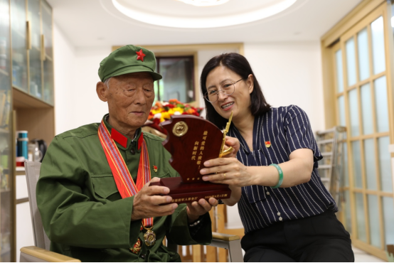 志愿者为老兵安福英赠送荣誉激励牌