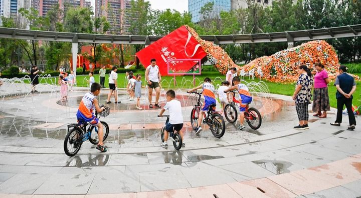 8月3日,小朋友在长拖1958后的广场上玩耍。(新华社记者 颜麟蕴 摄)