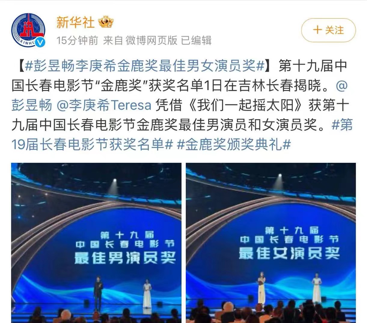 新华快报丨彭昱畅、李庚希获第十九届中国长春电影节金鹿奖最佳男女演员奖