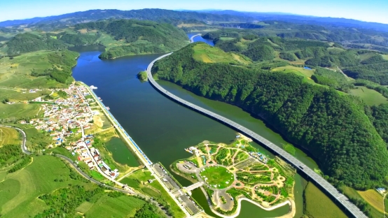 松花江自长白山奔流而下,丰满、红石、白山三座水电站的拦江大坝所形成的松花湖、红石湖、白山湖,如三颗璀璨明珠镶嵌在松花江上。