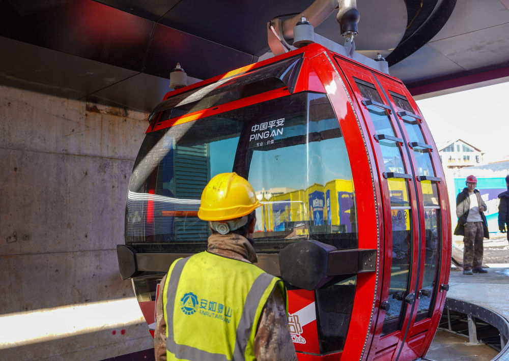 近期,吉林北大湖滑雪度假区的多条雪道陆续向旅客开放。在崭新的吊厢前,工作人员正对两条今年新增的国产索道进行最后的调试。