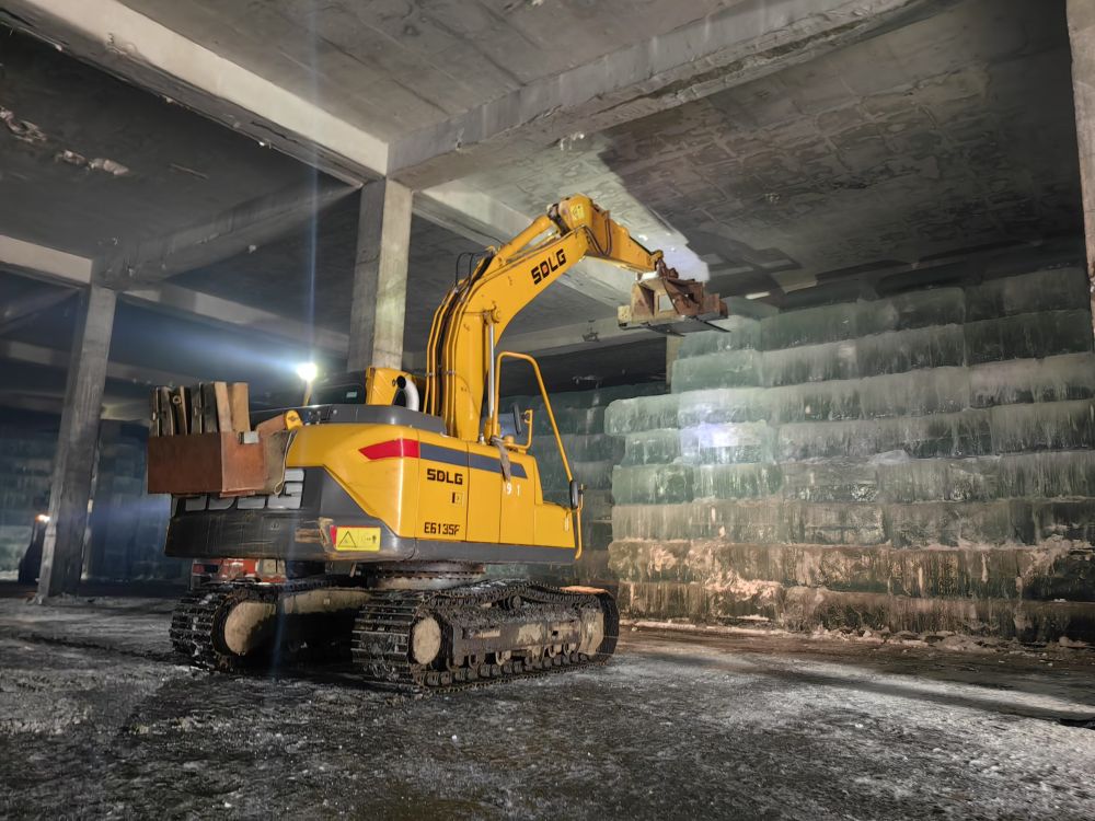 随着一声“开冰喽!”存冰仓库大门开启,带着上一年冰雪记忆的8万立方米存冰完好如初。早已准备就绪的叉车把一块块大“冰糖”装入卡车,源源不断运往占地156万平方米的施工现场,5000余名冰建工人和近千台机械作业设备立即投入建设,灯火通明,昼夜不停。