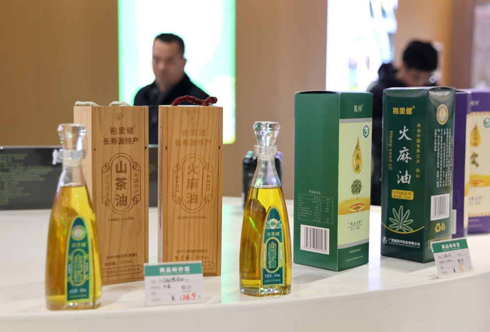这是在广西壮族自治区凤山县双创产业园展示的当地著名的土特产品山茶油和火麻油。