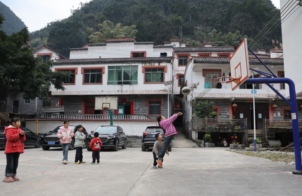 在广西壮族自治区凤山县三门海镇央峒村瑶寨屯,几名儿童正在打篮球。