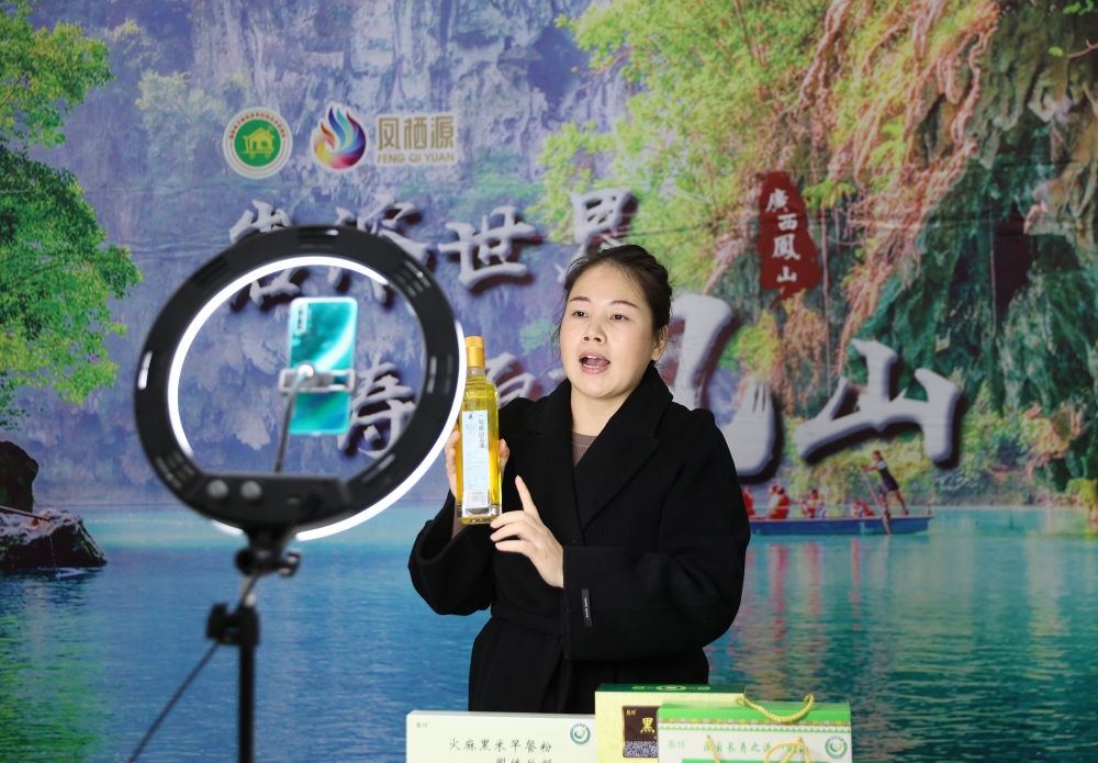 在广西壮族自治区凤山县双创产业园,电商主播正在介绍自己带货的产品。