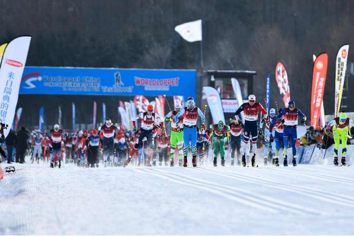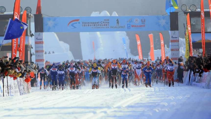 2020年1月4日,参赛选手在比赛中出发。当日,2020中国长春净月潭瓦萨国际滑雪节暨2020国际雪联越野滑雪中国巡回赛长春站比赛在长春举行,吸引来自30多个国家和地区的千余名选手参赛。新华社记者 雒圆 摄