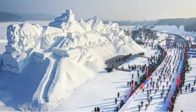 2023年1月4日,参赛选手在比赛中(无人机照片)。当日,第21届中国长春净月潭瓦萨国际滑雪节在吉林省长春市拉开帷幕,330余名中外选手参赛,共同感受越野滑雪运动带来的快乐。新华社记者 许畅 摄