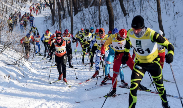 2017年1月4日,参赛选手从起点出发。当日,2017中国长春净月潭瓦萨国际越野滑雪节暨国际雪联50公里积分赛在长春举行,来自30多个国家和地区的1000余位专业选手参赛。新华社记者 林宏 摄
