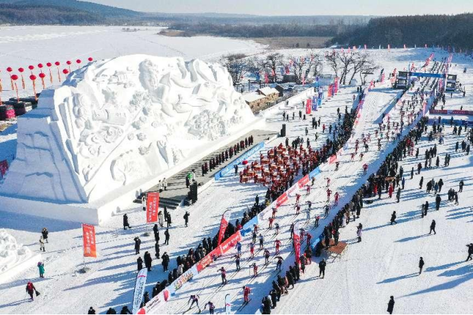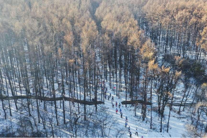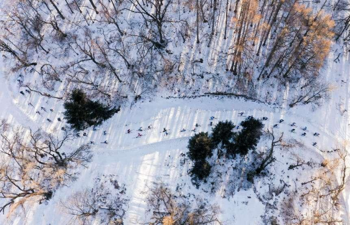2020年1月4日,参赛选手在起点出发(无人机拍摄)。当日,2020中国长春净月潭瓦萨国际滑雪节暨2020国际雪联越野滑雪中国巡回赛长春站比赛在长春举行,吸引来自30多个国家和地区的千余名选手参赛。新华社记者 许畅 摄