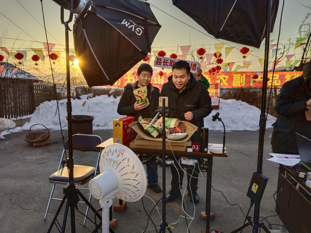 这是2025年1月底在长白朝鲜族自治县举行的年货节现场,副县长高世龙(右)和村民一起推销当地特产。(受访者供图)