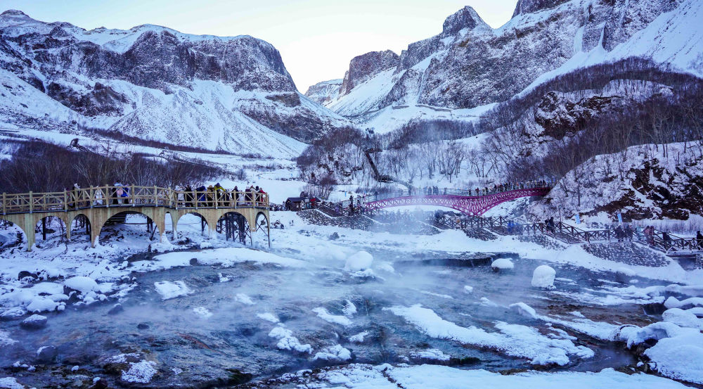 长白山天池以北的延边州,温泉室外的树枝上覆满积雪,泡池内滚烫的地热源源不断。伸出脚尖触水,一股暖意传遍全身。延边云集安图火山泉、龙井氟温泉、延吉低氘温泉等多种特色温泉,吸引海内外众多游客慕名而来。