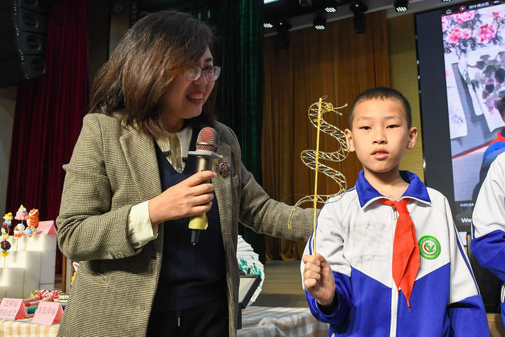 2月24日,在吉林省第二实验朝阳学校,学生展示自己制作的糖画。