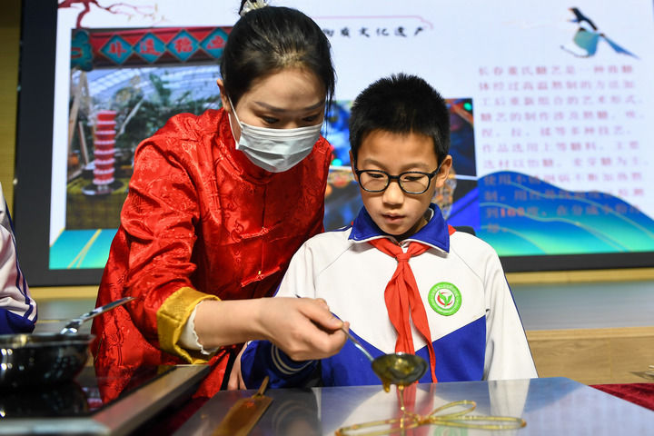 2月24日,在吉林省第二实验朝阳学校,学生们学习制作糖画。