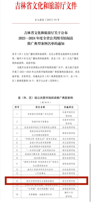 春日启新程,喜报传千里。近日,吉林省文化和旅游厅公布了2023—2024年度全省公共图书馆阅读推广典型案例名单,全省共有18个县(市、区)级公共图书馆阅读推广案例入选,“敦化市图书馆总分馆体系建设”项目获此殊荣。