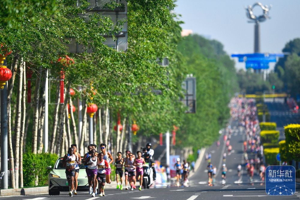 ↑埃塞俄比亚选手塞博卡·内古斯·埃尔(前左)在比赛中,他以2小时12分43秒的成绩获得马拉松男子组冠军。新华社记者 许畅 摄
