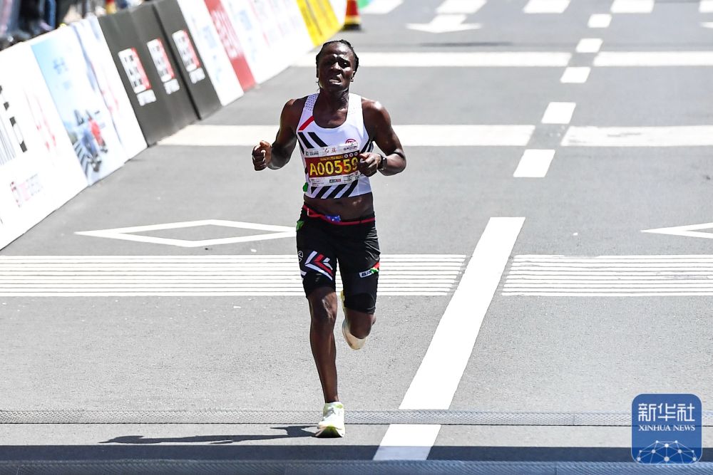 ↑肯尼亚选手瓦马卢瓦·吕德拉·纳利亚卡在比赛中冲线,她以2小时37分04秒的成绩获得马拉松女子组亚军。新华社记者 张楠 摄
