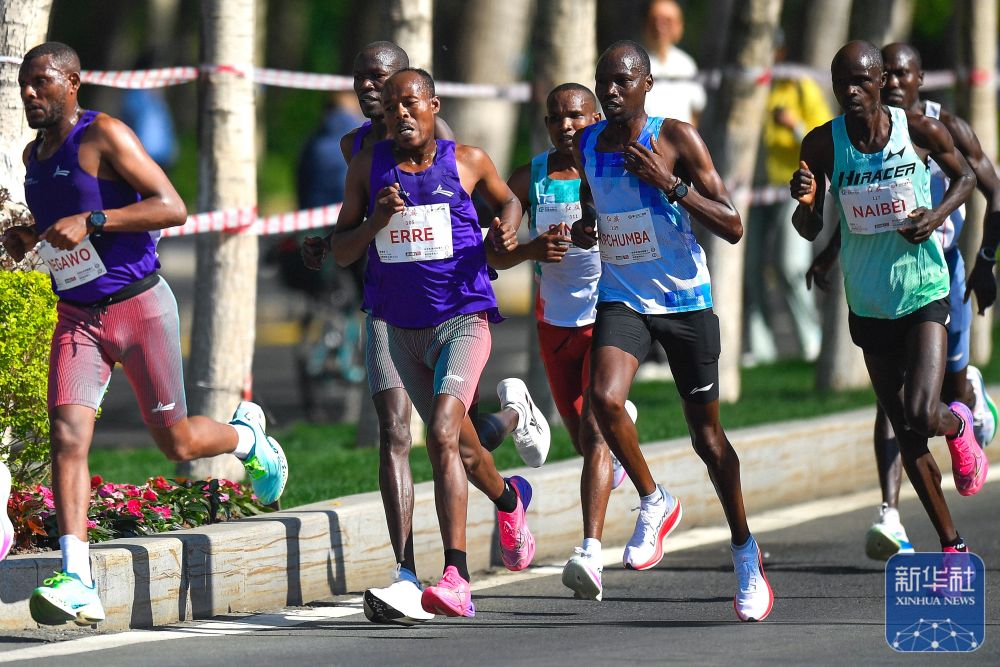↑埃塞俄比亚选手塞博卡·内古斯·埃尔(左三)在比赛中,他以2小时12分43秒的成绩获得马拉松男子组冠军。新华社记者 许畅 摄
