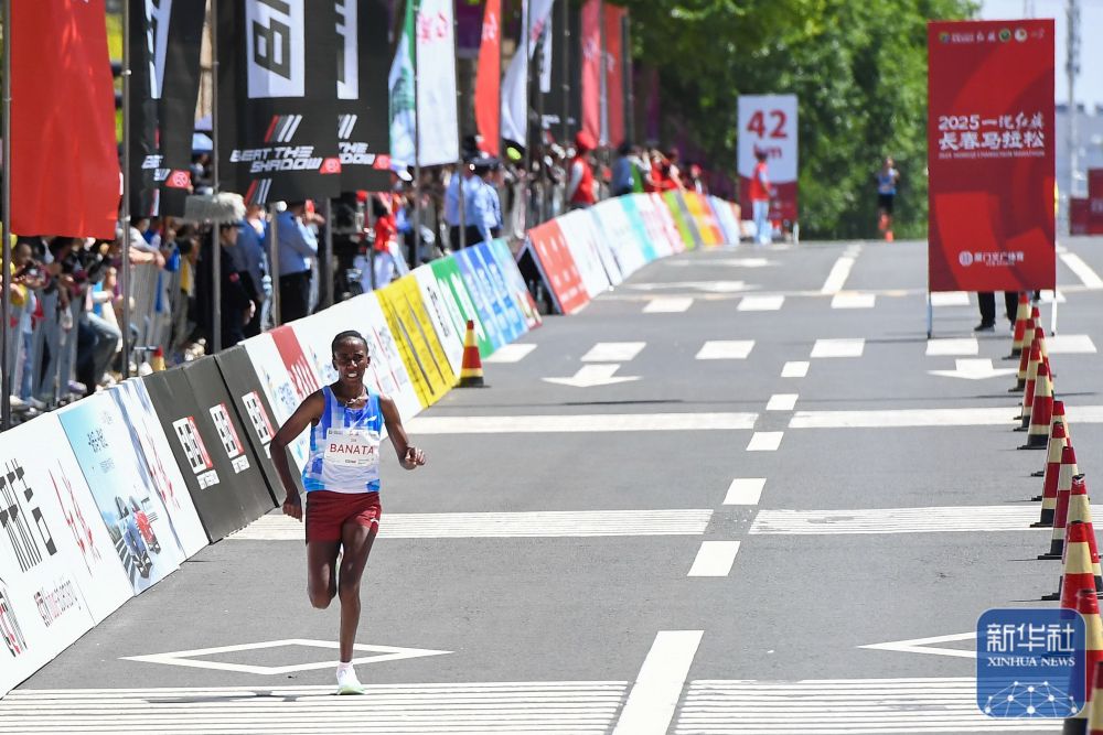 ↑埃塞俄比亚选手阿莱米图·海罗约·巴娜塔在比赛中冲线,她以2小时39分02秒的成绩获得马拉松女子组季军。新华社记者 张楠 摄