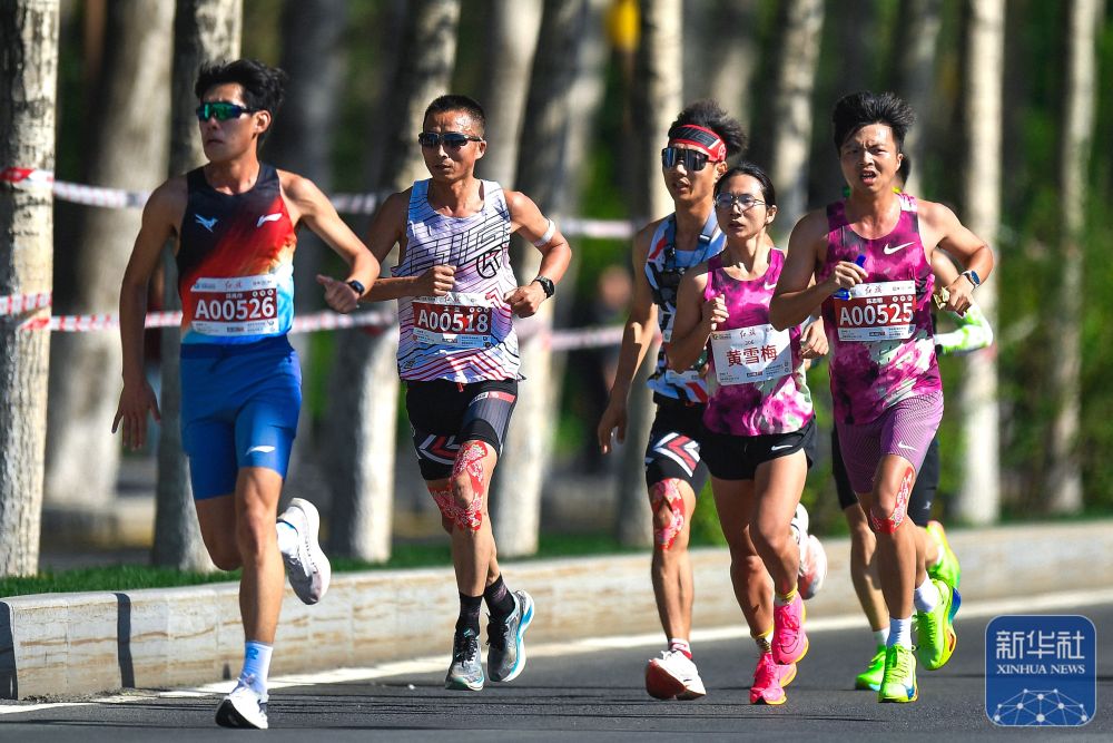 ↑中国选手黄雪梅(右二)在比赛中,她以2小时33分48秒的成绩获得马拉松女子组冠军。新华社记者 许畅 摄
