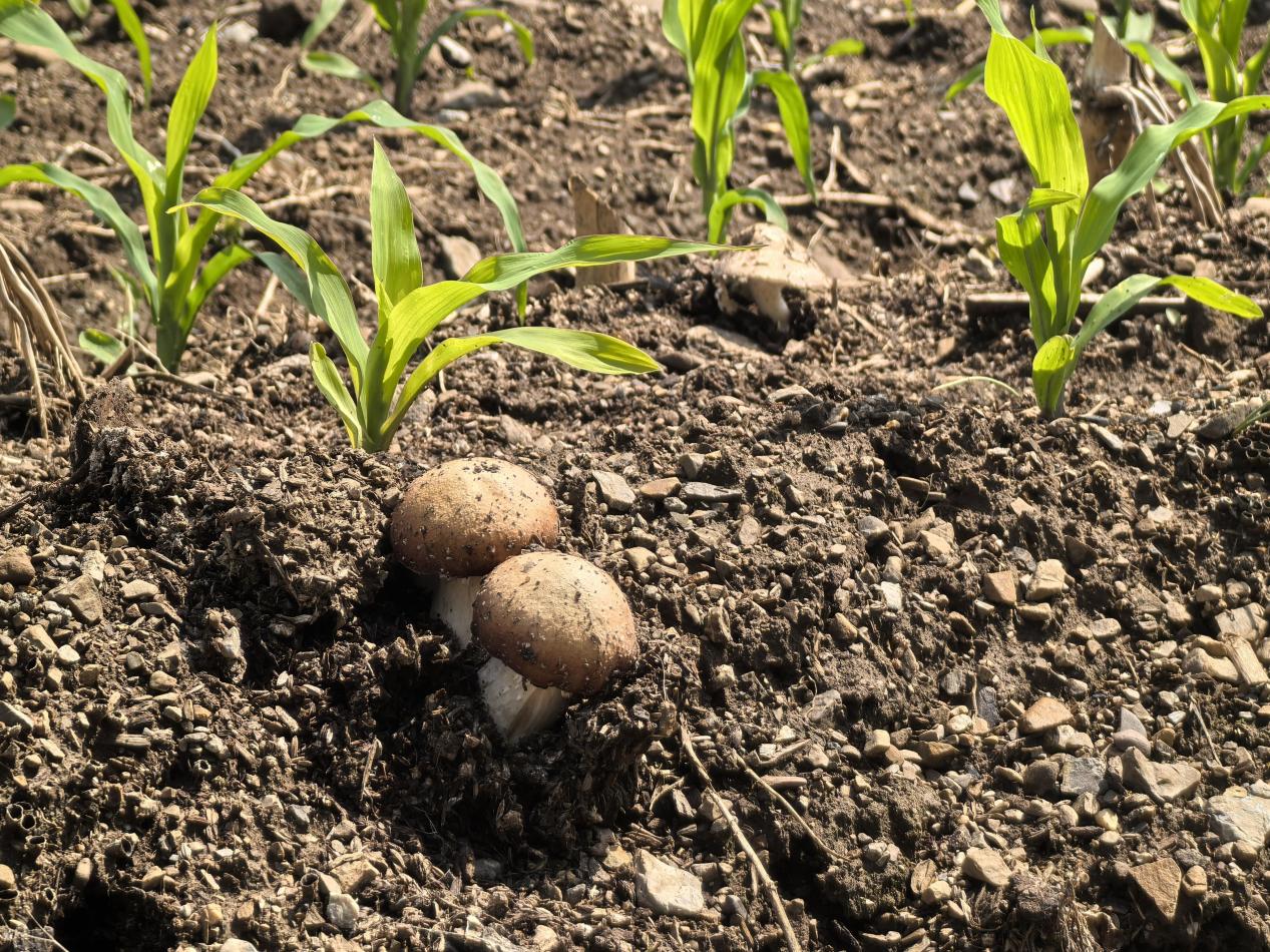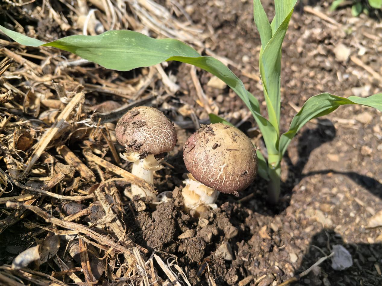 张惠新说:“在去年秋收后,我们就将菌种播撒到地里,秋末提前发育菌丝,再经过一冬休眠,春天就可以出菇。菌种的基料也成为有机肥料,为玉米生长提供养分,形成良性互促。”