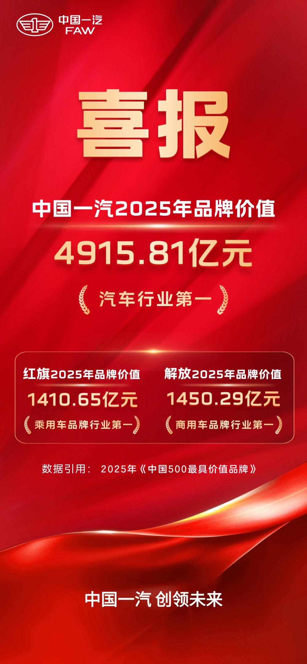 6月18日,第二十二届“世界品牌大会”在北京举行。会上,世界品牌实验室发布了2025年《中国500最具价值品牌》分析报告,中国一汽2025年品牌价值为4915.81亿元,蝉联汽车行业第一,连续22年上榜中国500最具价值品牌。中国一汽两大自主品牌也获得佳绩。“红旗”2025年品牌价值为1410.65亿元,位列乘用车品牌行业第一;“解放”2025年品牌价值为1450.29亿元,位列商用车品牌行业第一。