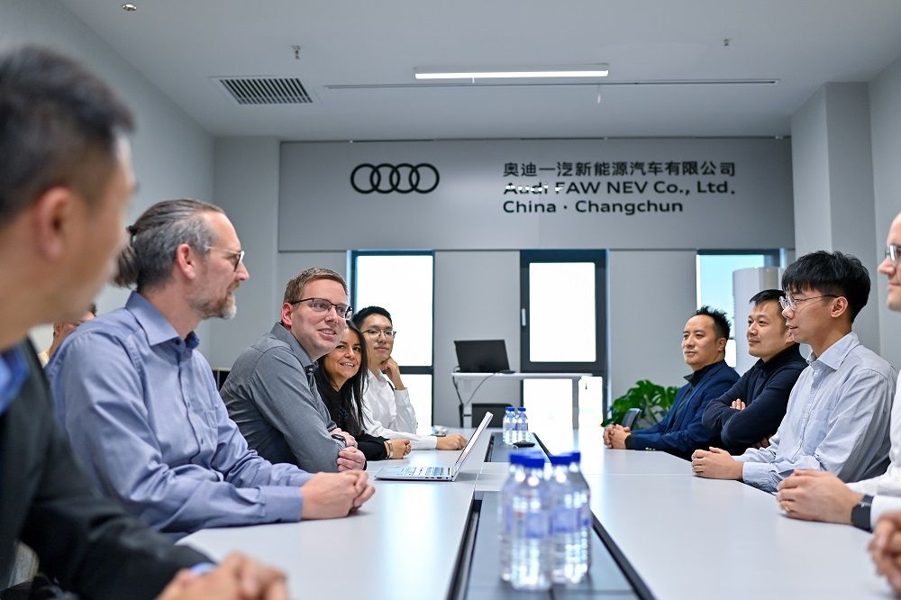 2023年11月,德国工程师萨沙(左三)与妻子约翰娜(左四)在位于吉林长春的奥迪一汽新能源汽车有限公司会议室开会。(颜麟蕴 摄)