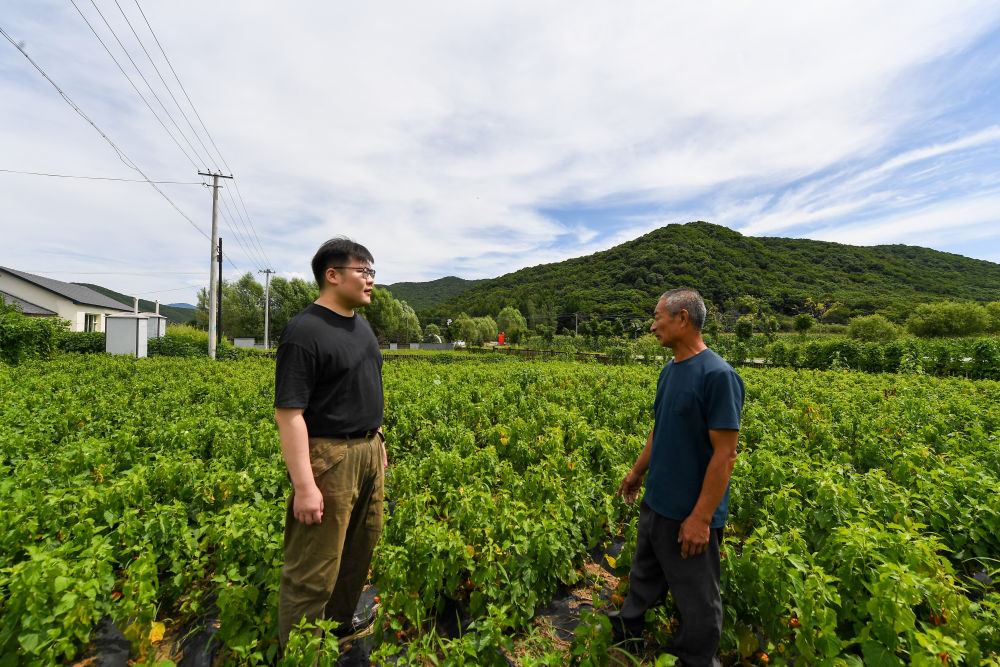↑ 8月11日,在磐石市官马新村,马铖明(左)和村民查看红菇娘长势。
