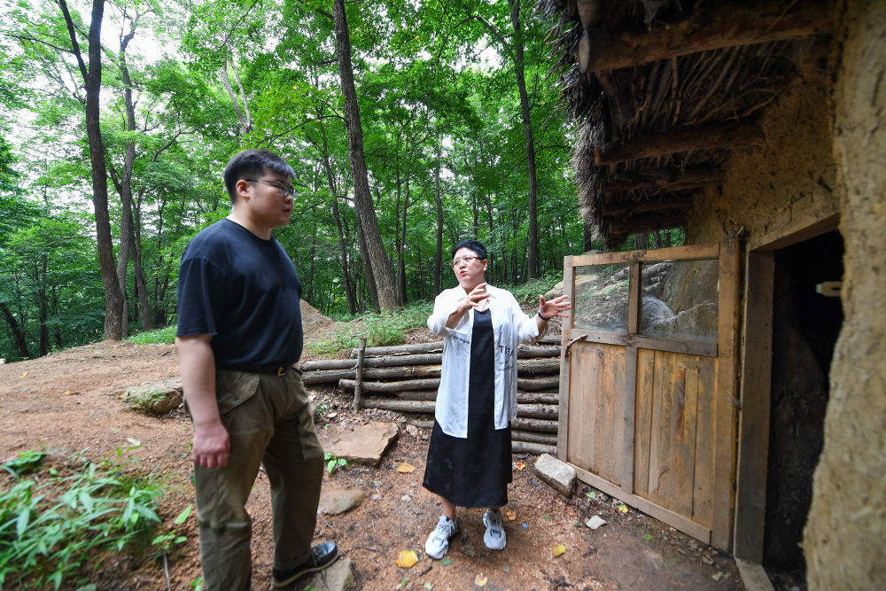 ↑ 8月11日,在位于吉林磐石的红石砬子抗日根据地遗址,磐石市抗日斗争纪念馆馆长李秋虹(左)向马铖明介绍抗联历史。