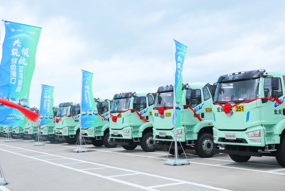 ▲一汽解放与招商港口185辆新能源港口牵引车交付