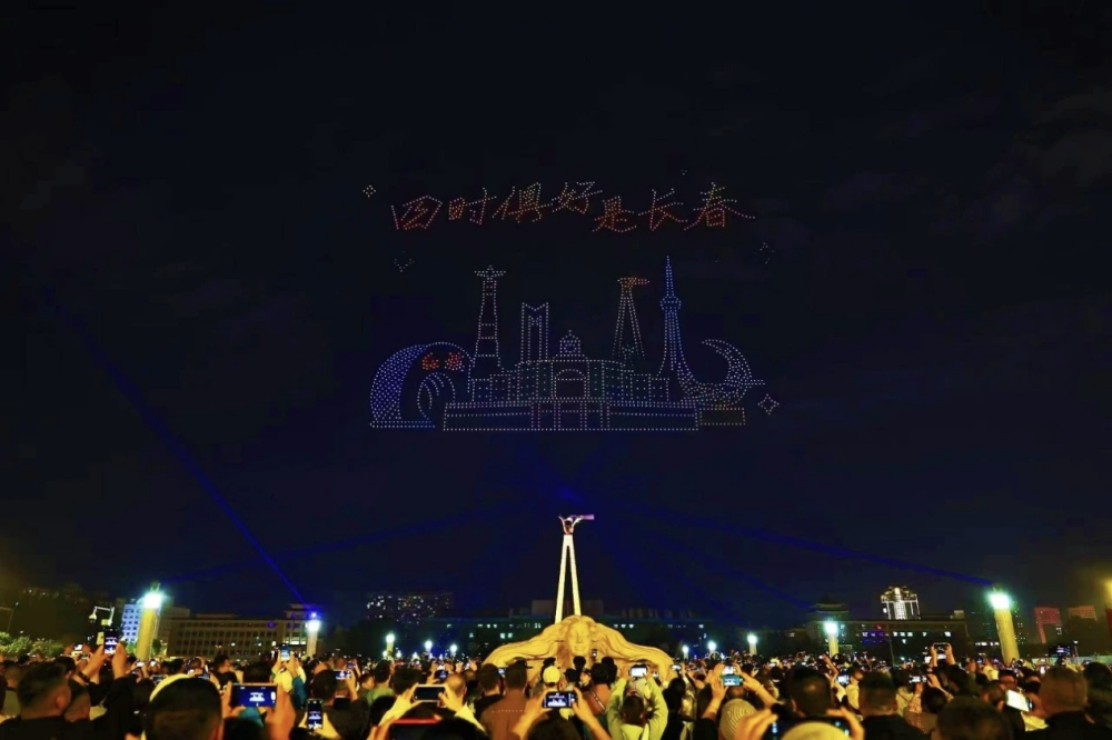 20日晚,长春文化广场上的无人机表演,吸引众多市民游客观看。