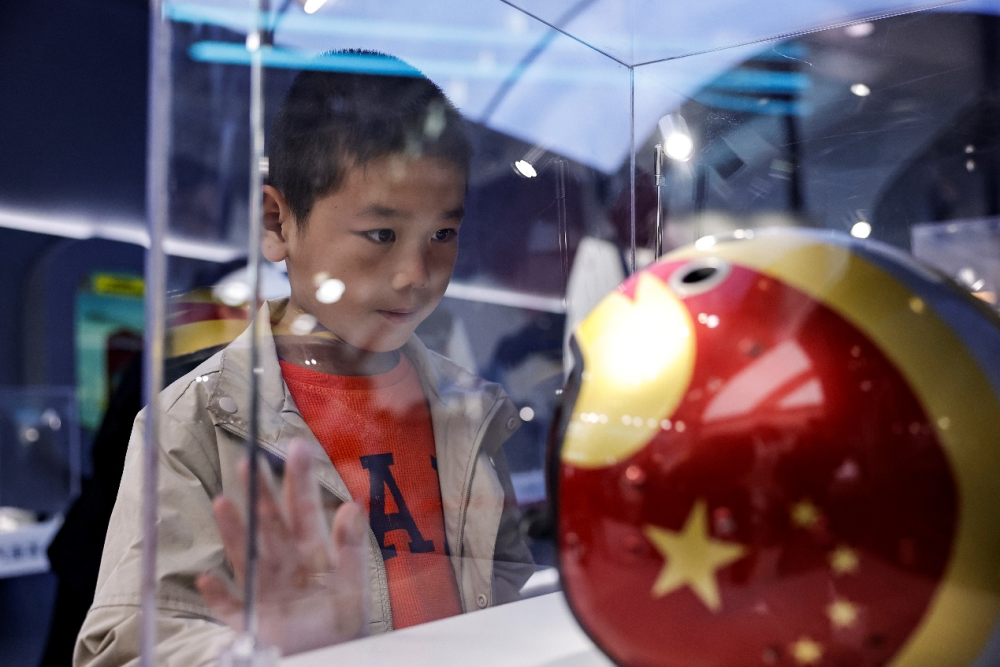 22日,在长春航空展上,一名小朋友参观展品。新华社发