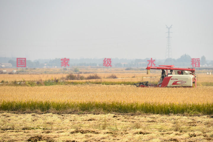 10月14日,在吉林省公主岭市,农民驾驶农机收割水稻。